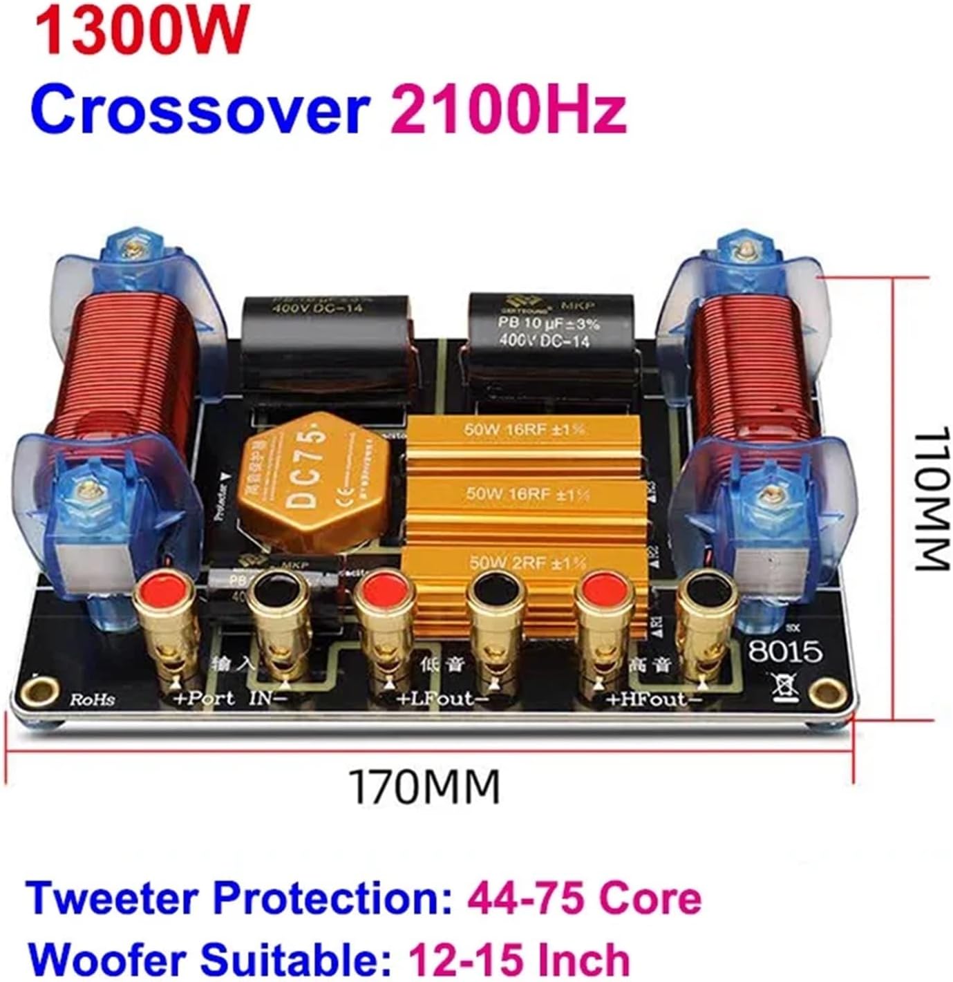 Frequency DividersSpecificationsProduct Name: 2 Way Frequency DividerCrossover Frequency: 1900-2200HzTweeter :24dB/octWoofer:24dB/octImpedance: 4-8 ohmPeak Power: 550-1800WPackage Included:1 Piece Frequency Divider