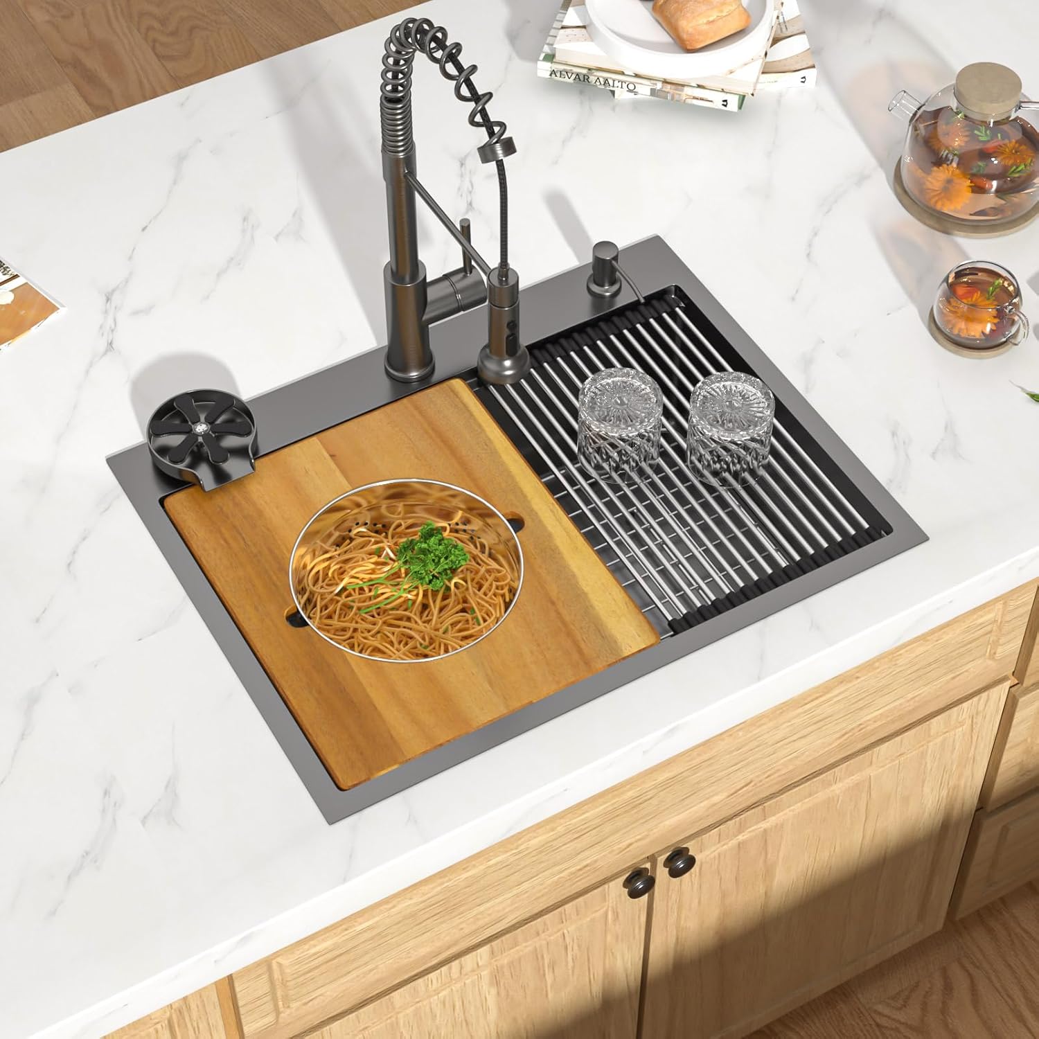 | Included Components | 28 Inch Black Drop In Kitchen Sink, Drain Assembly, Installation Hardware, Mixing Bowl and Pasta Stainer, Stainless Steel Bottom Rinse Grid, 1:1 Countertop Cutout Template, Stainless Steel Roll-up Drying Rack, Wooden Cutting Board |