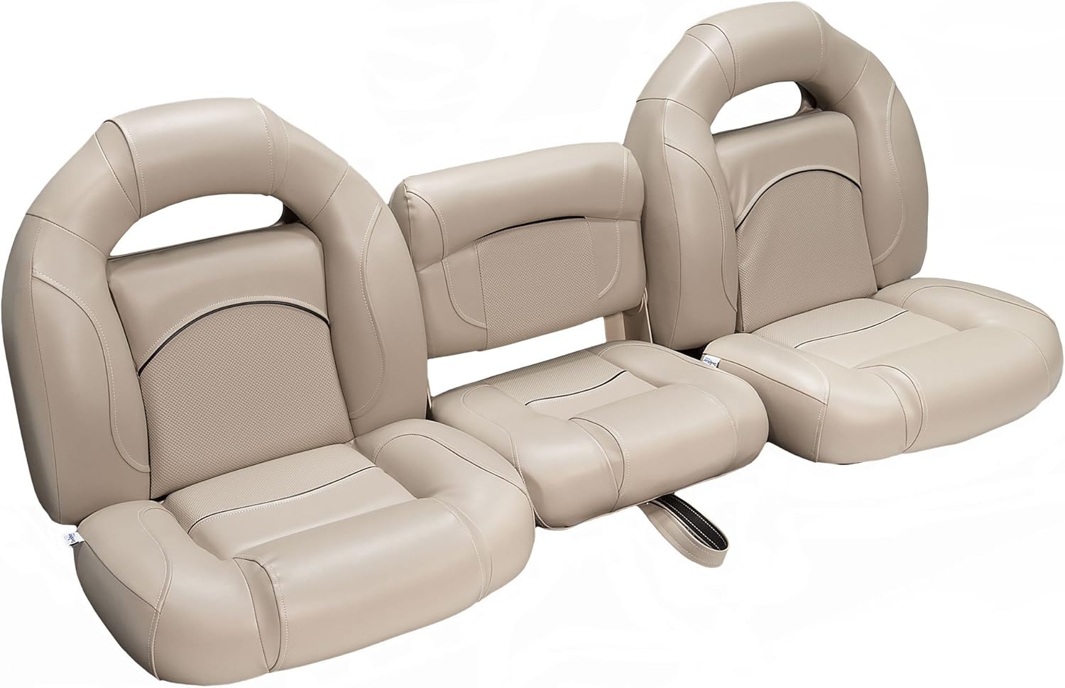61" Bass Boat Bench Seat Package. Driver and passenger side two-piece bucket seats Back and seats. Seat cushions attach separately for easy installation. Each bucket seat measures 22" wide with a 17" wide center fold down seat w/ hold down strap. Center seat folds flat and is designed as a step. These are factory grade replacement bass boat seats with a 3 year full replacement warranty. 30oz soft to the touch, marine grade seat vinyl Custom molded foam cushions won't break down Plastic frames with 100% stainless steel hardware All mounting hardware is included (stainless)