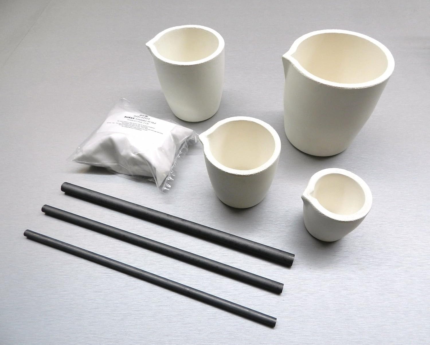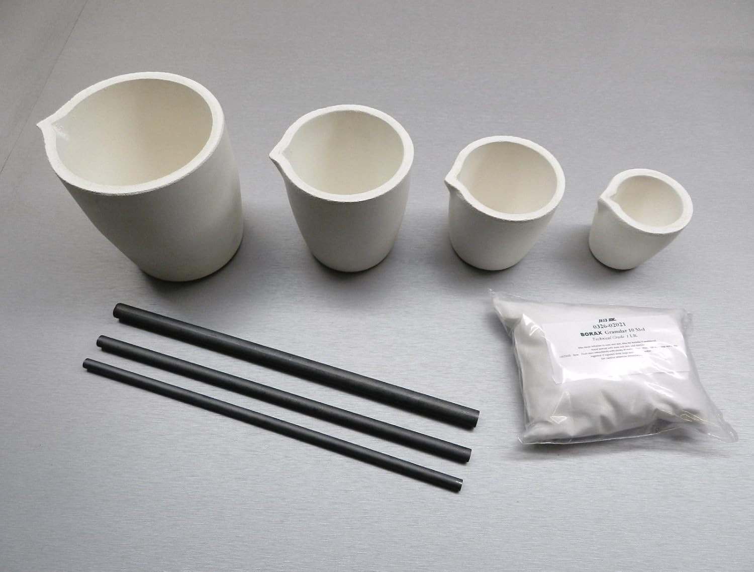 ๐ป JETS PRODUCT # 1020-3058 SPECIFICATIONS: ๐ป ๐ธ 1. SMALL Crucible Capacity: 18Toz. - 500gr. - Volume 70cc Height: 2-5/8" - 66.6mm Diameter OD Top: 2-5/8" - 66.6mm Interior Diameter: 2" - 53mm Interior Depth: 2-3/8" - 60.4mm Diameter OD Bottom: 2" - 50mm Crucible Wall Thickness: 5/16" - 8mm Crucible Weight: 7oz. ๐ธ 2. MEDIUM Crucible Capacity: 40Toz. - 1200gr - Volume 200cc Height: 3-1/2" / 89mm Diameter OD Top: 3-1/2" / 89mm Interior Diameter: 2-15/16" / 75mm Interior Depth: 3-9/64" / 80mm Diameter OD Bottom: 2-3/4" / 70mm Crucible Wall thickness: 5/16" / 8mm Crucible Weight: 12oz. ๐ธ 3. LARGE Crucible Capacity: 80Toz. - 2488gr - Volume 350cc Height: 4-7/16" / 113mm Diameter OD Top: 4" / 100mm Interior Diameter: 3-13/32โ / 86.6mm Interior Depth: 4-3/16" / 106mm Diameter OD Bottom: 3" / 77mm Crucible Wall Thickness: 1/4" / 6.4mm Crucible Weight: 18oz. ๐ธ 4. X-LARGE Crucible Capacity: 150Toz. - 4665gr - Volume 700cc Height: 5-17/64" / 133.8mm Top Outside Diameter: 4-7/8" / 124mm Top Interior Diameter: 4-13/64" / 106.9mm Interior Depth: 4-13/16" / 122.3mm Diameter OD Bottom: 3-13/16" / 96.8mm Crucible Wall Thickness: 5/16" / 7.9mm Crucible Volume: 700cc Crucible Has a 5/8" Pouring Spout Crucible Weight: 33oz. ๐ธ 5. Carbon Rod Diameter & Length: 1/2" x 12" ๐ธ 6. Carbon Rod Diameter & Length: 3/8" x 12" ๐ธ 7. Carbon Rod Diameter & Length: 5/16" x 12" ๐ธ 8. Borax Specification: 5 Mol Borax (Sodium Tetraborate Pentahydrate) Weight: 1 Pound Bag