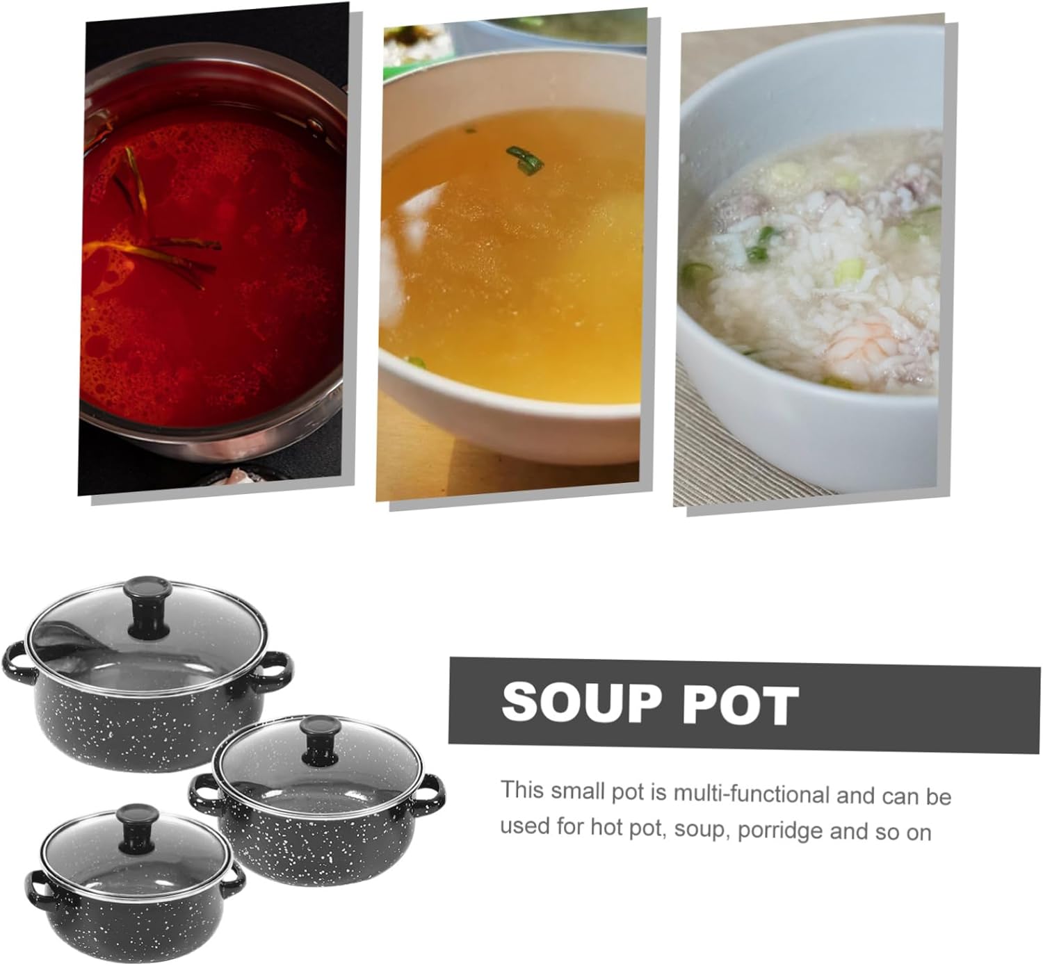 Package List 1 x soup pot (small) 1 x soup pot (middle) 1 x soup pot (large) Features - Size: 16.00X16.00X7.80cm/6.29X6.29X3.07in cooking saucepan -Material:Enamel pot with lid -Color:Black sauce pans with lids - Size: 24.00X20.00X10.00cm/9.43X7.86X3.93in enamel cookware - Size: 18.00X18.00X8.20cm/7.07X7.07X3.22in cookware -Compact size is perfect for small kitchens or storage space. Elegant finish adds a touch of sophistication enameled cooking pot -The enamel material used in the soup pot with double handles, flat bottom, can be used for longtime cooking stock pot -Double handles make these multi-functional stock pots easy to serve and share with friends and family stock pots with lids -Flat bottom design allows for use on any stovetop surface. You can use these pots with confidence in daily stock pot with lid -Will not change the taste of milk, tea or any other food, . It's also a good heating ability enamel stock pot with lid.Goods Informationcooking stock pot It can be placed directly on the stove to heat the food.stock pot with lid The multi-functional pot is made of enamel material, and it is easy to clean.cookware And it has a lid, very practical to be used in kitchen.enamel soup pot Useful kitchen cooking tool that can be used for cooking noodle, porridge or soup